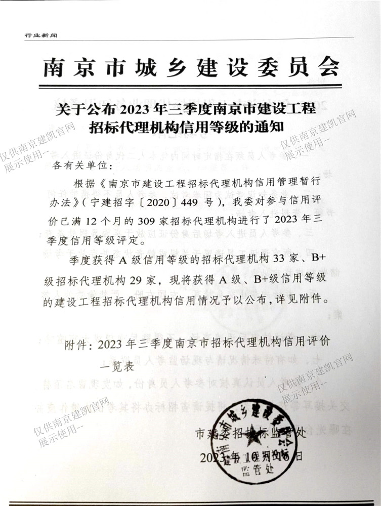 熱烈祝賀我司招標(biāo)代理機(jī)構(gòu)在“2023年三季度南京市建設(shè)工程招標(biāo)代理機(jī)構(gòu)信用評(píng)價(jià)等級(jí)A”