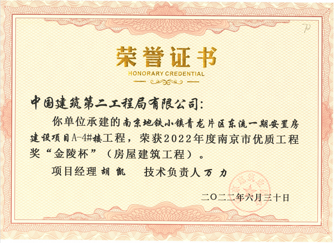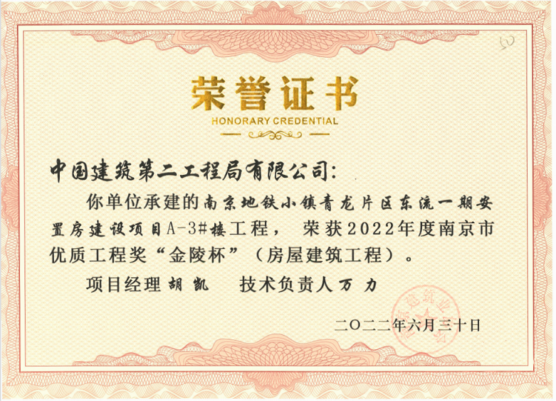 (2022年6月30日)地鐵小鎮(zhèn)青龍片區(qū)東流一期安置房建設(shè)項(xiàng)目A-3#樓、A-4#樓榮獲《2022年度南京市優(yōu)質(zhì)結(jié)構(gòu)“金陵杯”》獎(jiǎng)
