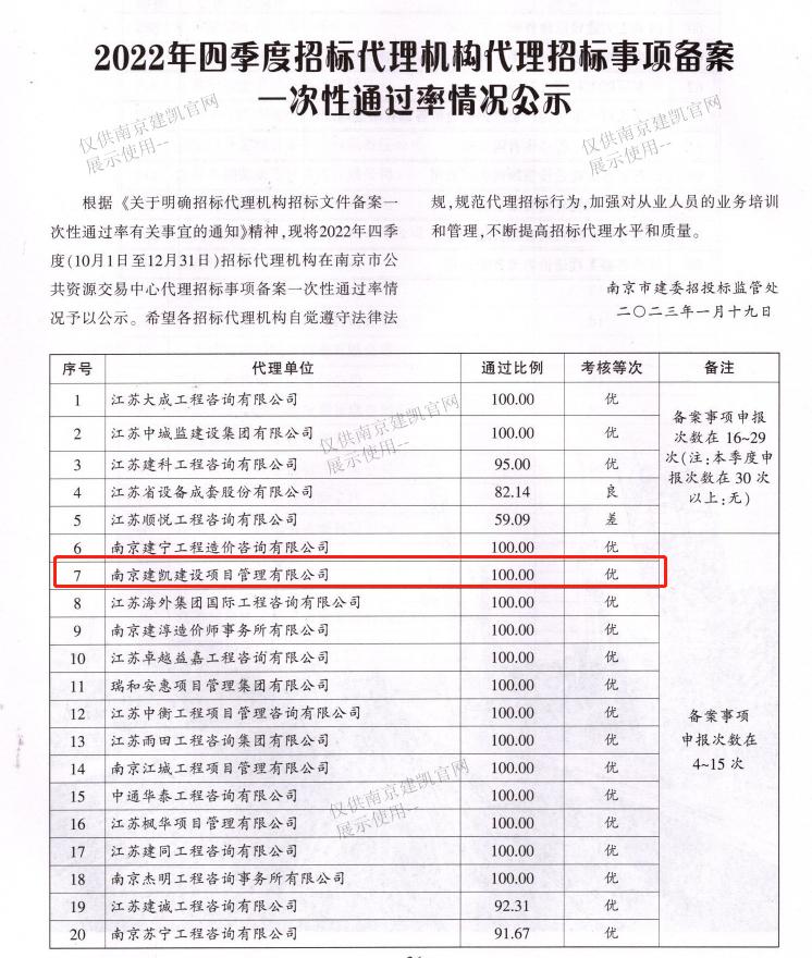 熱烈祝賀我司招標(biāo)代理機(jī)構(gòu)在2022年四季度招標(biāo)代理機(jī)構(gòu)代理招標(biāo)事項(xiàng)備案一次性通過率中獲得100%通過率,考核等次為優(yōu)。